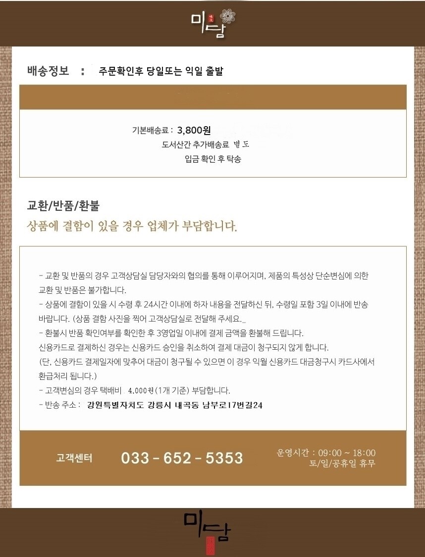 | 주소 : 강원특별자치도 강릉시 남부로17번길 24 내곡동 보건소옆 통신판매업 신고 : 제2019-강원강릉-0252호 | 연락처 : 033-652-5353 | FAX : 0504-237-2258 | 개인정보보호 책임자 : 최광희 | 대표자 : 전은숙 contact : ever0109@naver.com for more information. hosting by ㈜ 가 비 아 씨 엔 에 스 |